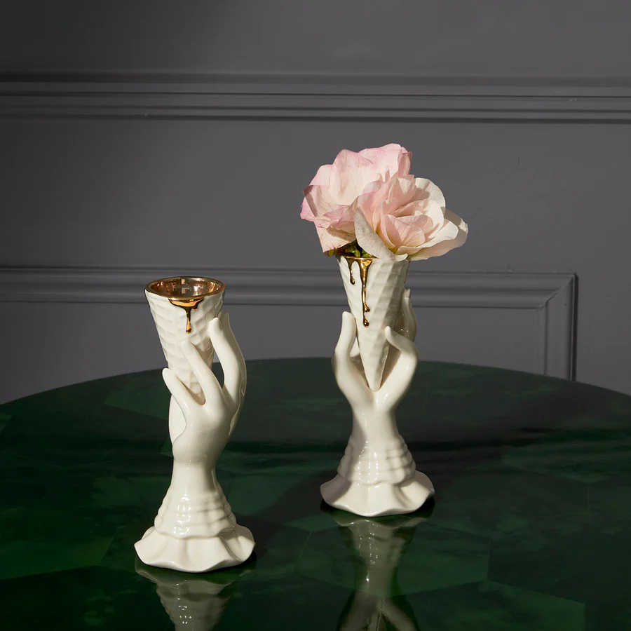 Our iconic I-Scream Vase (featuring flawless, fluid lines and an Elizabethan ruff sleeve) just got another delicious detail—a lined cone dripping with gleaming, real gold glamour.